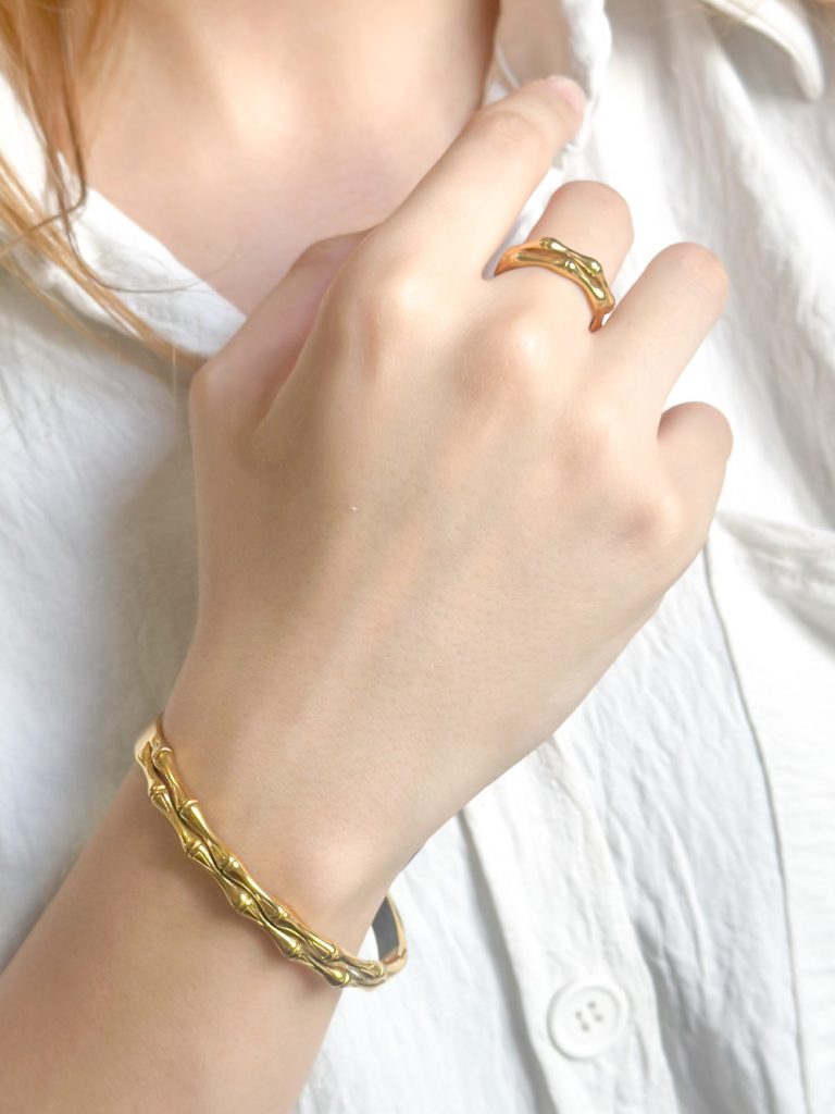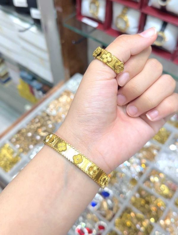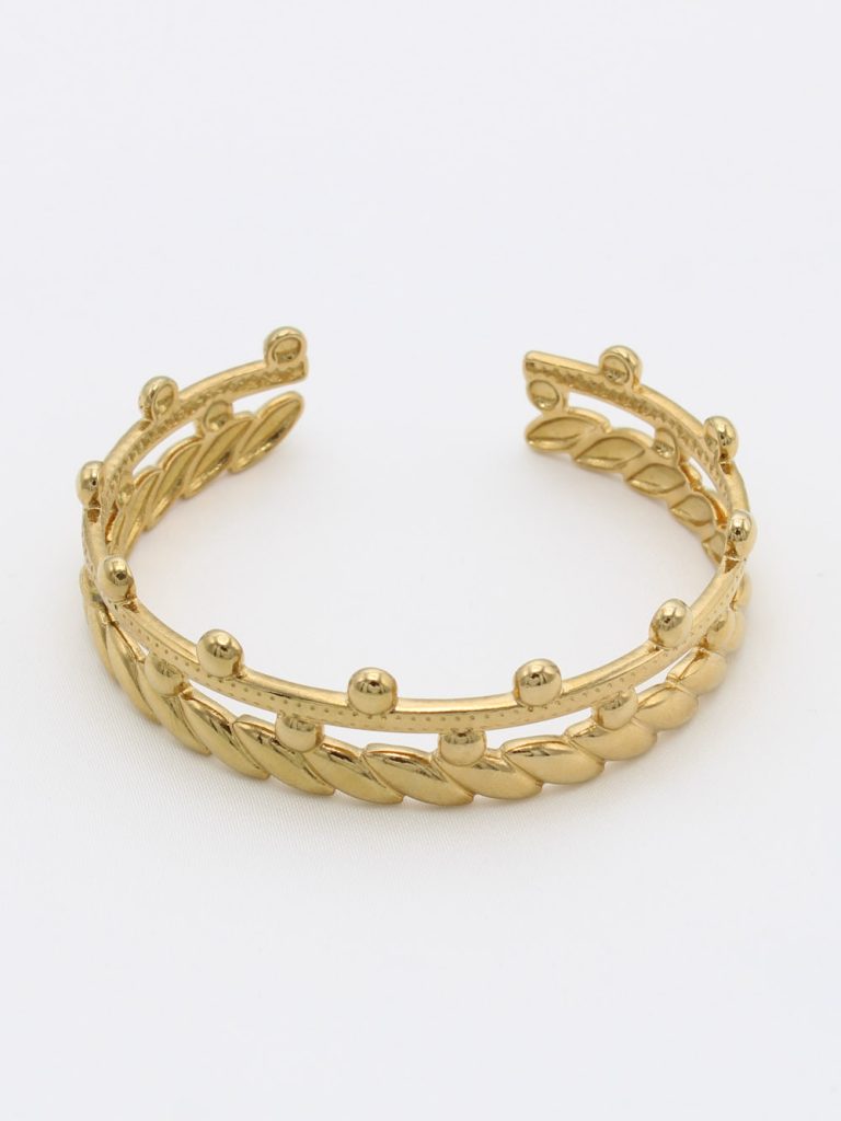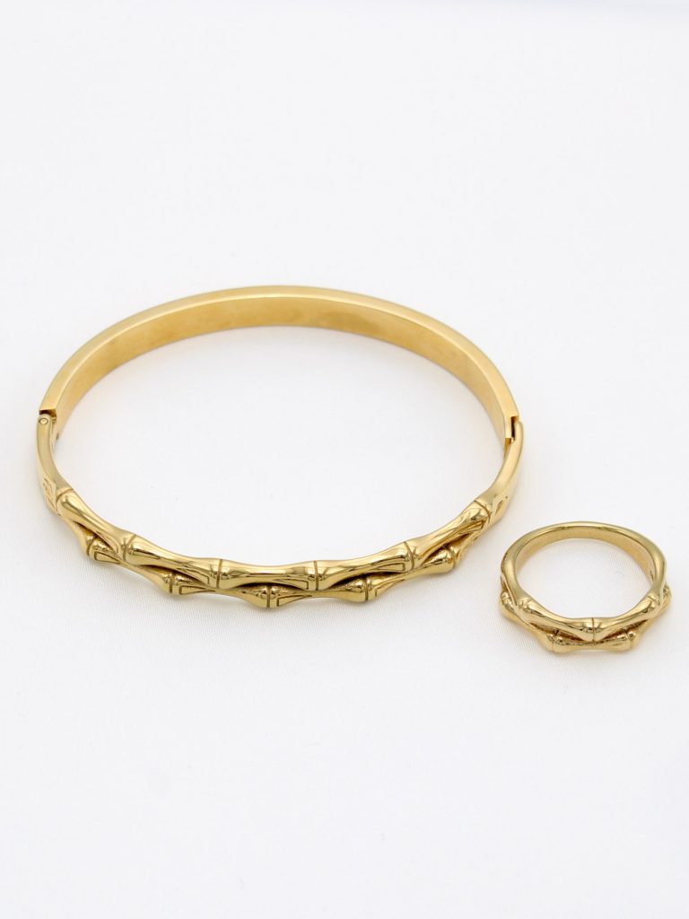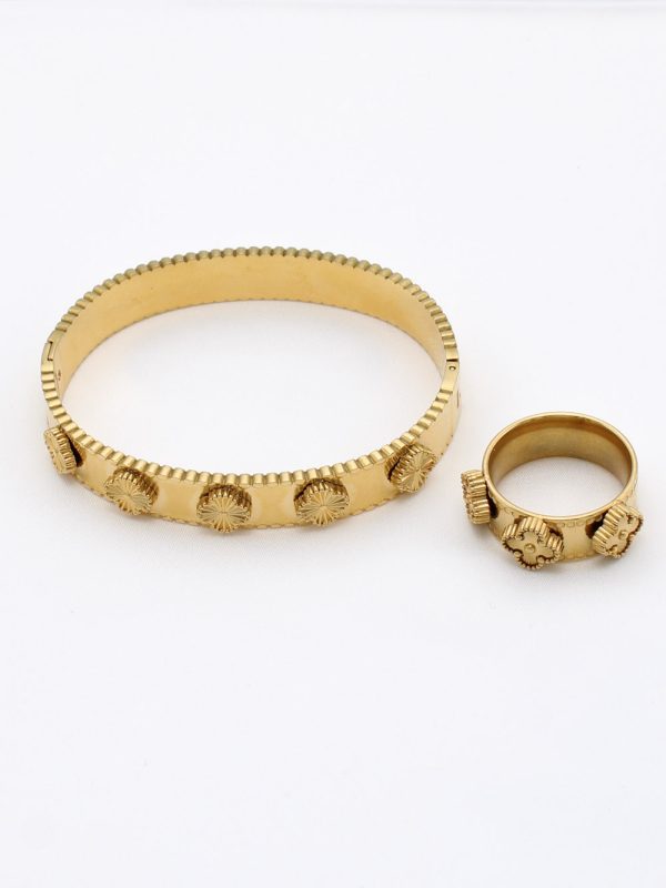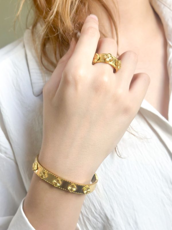 « Ce duo raffiné, composé d’un bracelet et d’une bague dorés, s’inspire de la beauté du trèfle porte-bonheur. Sa finition brillante et ses lignes pures en font un bijou à la fois romantique et sophistiqué. Symbole de féminité et d’harmonie, il apporte une note précieuse et lumineuse à votre style.
