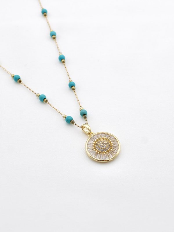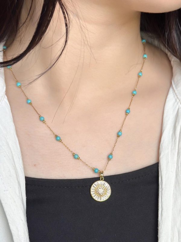 Un collier élégant en acier inoxydable, orné d’un pendentif rond et de fines perles bleues espacées sur la chaîne.