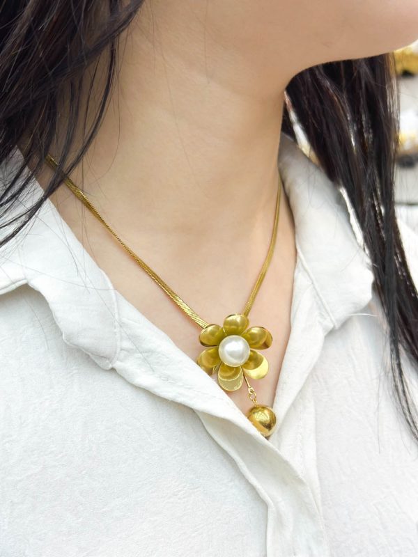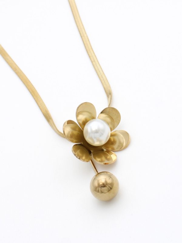 Sublimez votre style avec ce collier en acier inoxydable orné d’un grand motif fleur contenant de délicates perles blanches pour un look élégant et raffiné.