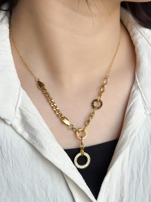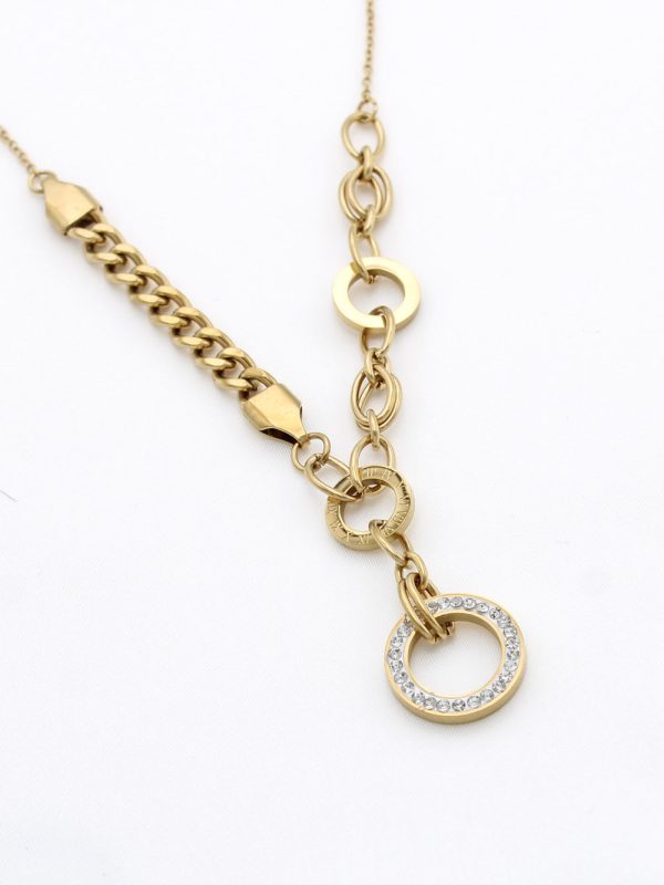 Sublime collier doré en acier inoxydable, orné d’anneaux élégants dont un serti de strass brillants, pour un look chic et moderne.
