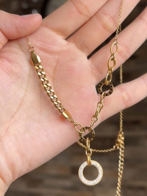 Ce collier raffiné en acier inoxydable doré se distingue par son design unique mêlant plusieurs maillons et anneaux décoratifs. La pièce maîtresse est un grand anneau orné de strass scintillants, apportant une touche d’éclat et de sophistication à votre tenue. À la fois moderne et élégant, il peut être porté aussi bien au quotidien qu’en soirée. Sa finition en acier inoxydable garantit une brillance durable et une résistance exceptionnelle.