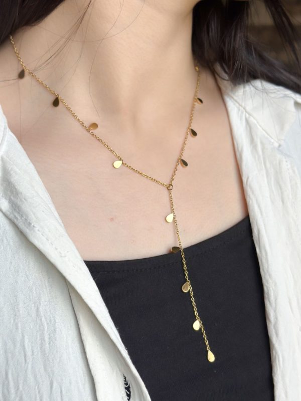 Un collier tendance en acier inoxydable, orné de petits bibelots délicats, avec une chaîne tombante en Y pour un effet raffiné.