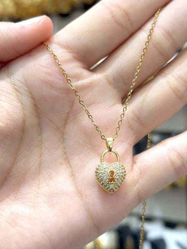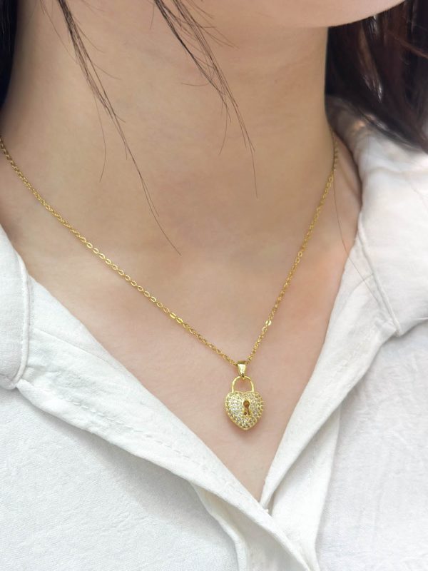 Collier raffiné avec pendentif cadenas en forme de cœur, doté d’une ouverture en clé, symbole d’amour et de protection.