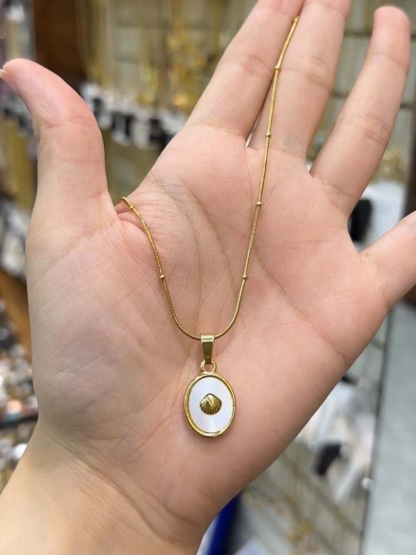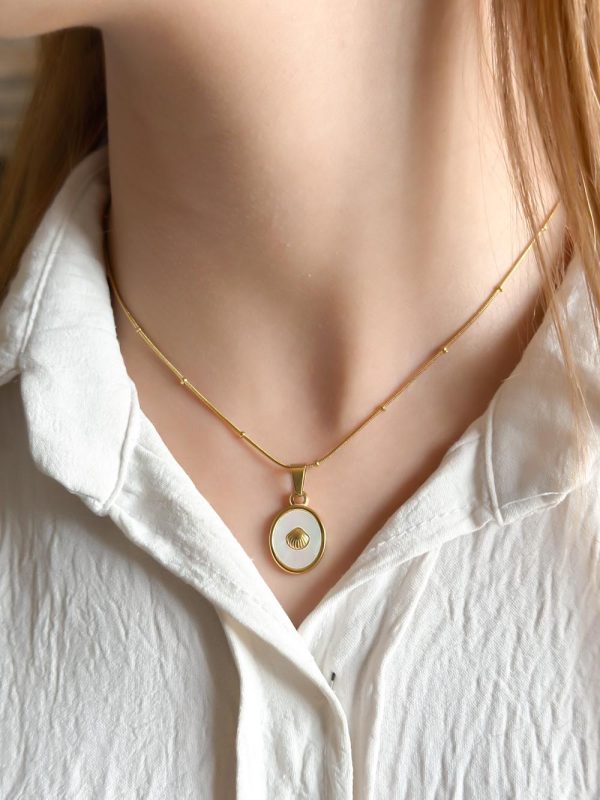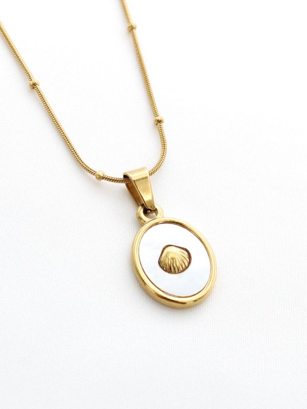 Collier raffiné en acier inoxydable, orné d’un pendentif doré à effet nacré renfermant une petite coquille marine.