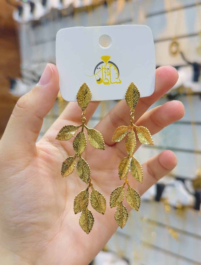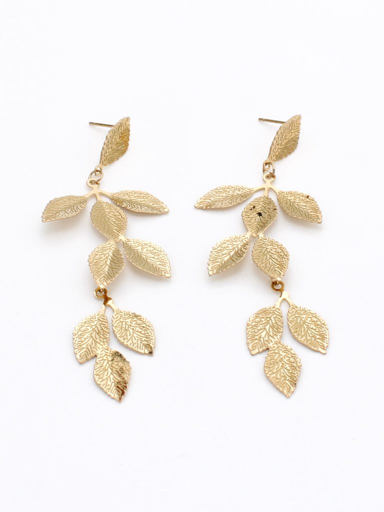750 DABoucles d’oreilles pendantes en forme de feuilles dorées, au design fin et ajouré, inspirées de la nature.