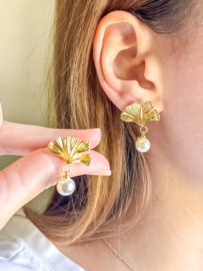 Boucles d’oreilles Feuille Perlée – Élégance naturelle et douceur nacrée P012102