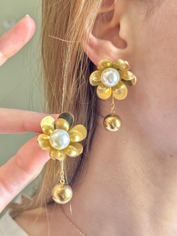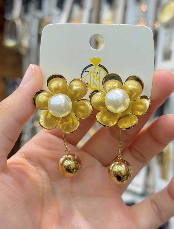 Boucles d’oreilles florales raffinées avec un motif rose et un détail pendant orné d’une perle blanche, pour une touche féminine et élégante.
