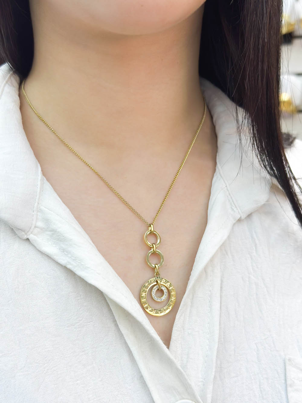 Un collier élégant en acier inoxydable, orné d’un pendentif composé de trois anneaux entrelacés et suspendus avec finesse.