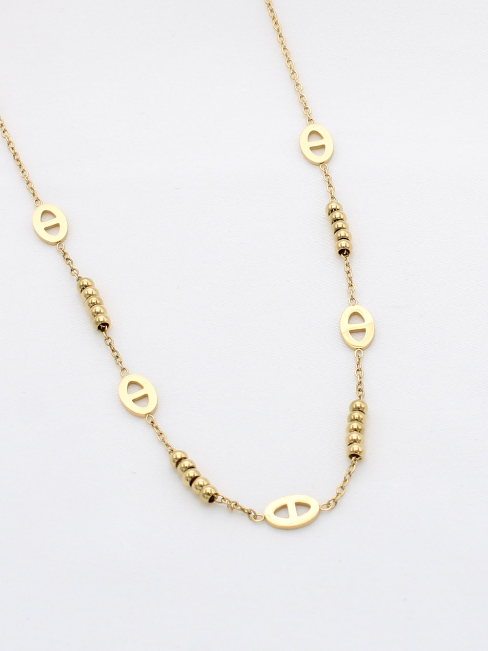Collier élégant signé Cartier, orné de maillons ovales emblématiques et de perles dorées raffinées.