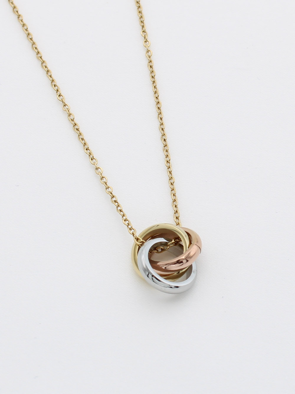 Collier iconique Cartier Trinity, composé de trois anneaux entrelacés en tons or, argent et rose doré.
