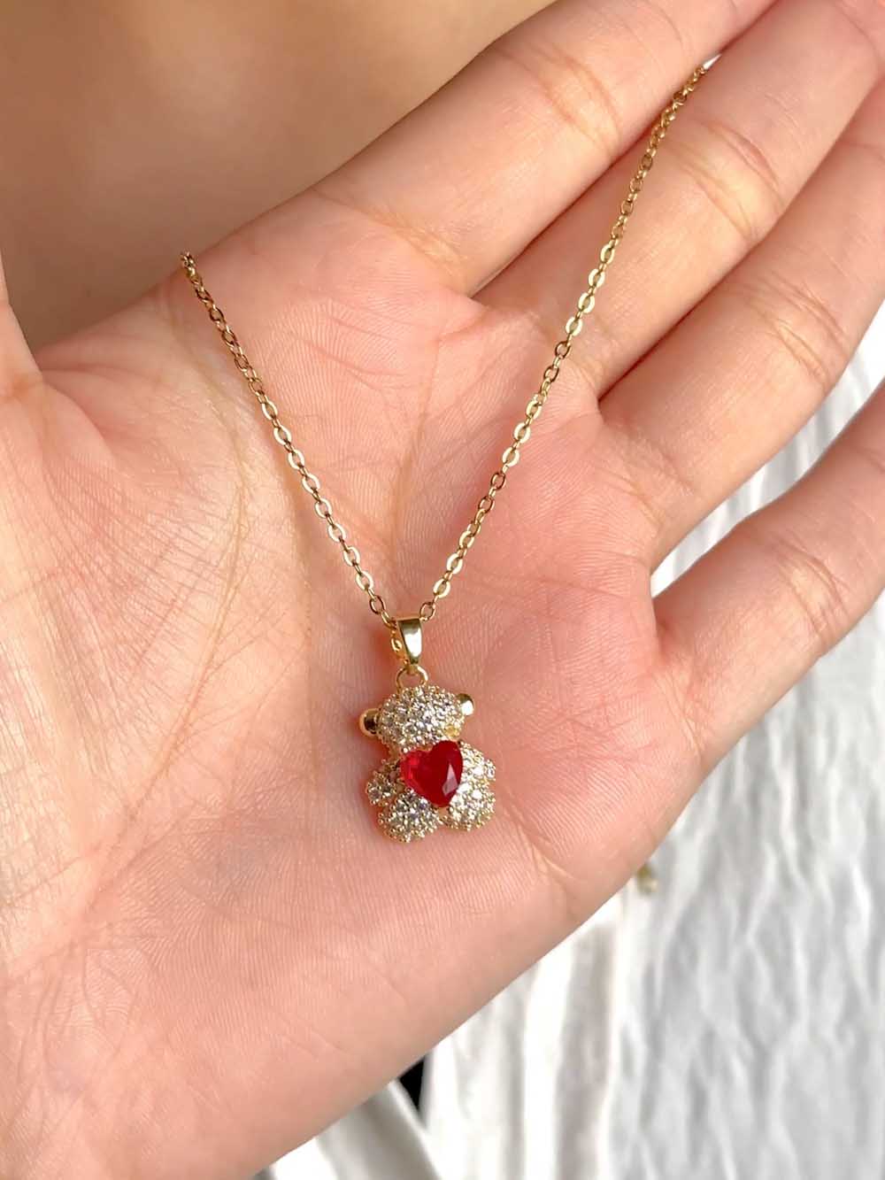 Collier mignon en acier inoxydable, orné d’un pendentif ourson contenant un petit cœur rouge.