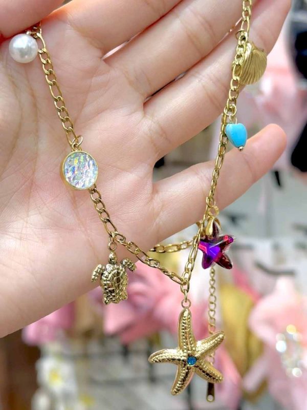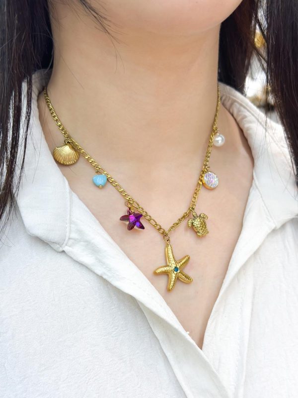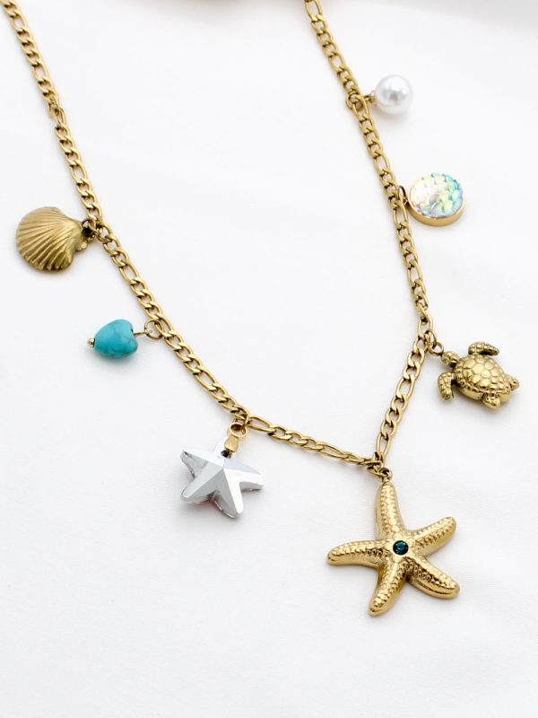 Collier élégant Bibelot en acier inoxydable, décoré de motifs marins variés : coquillage, étoile de mer, tortue et perle, pour un style estival et raffiné.