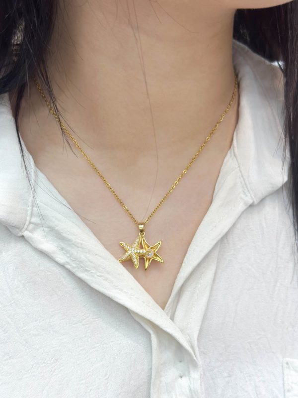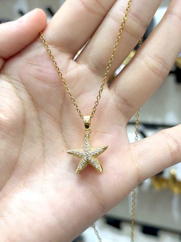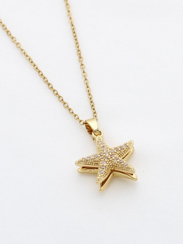 Collier élégant en acier inoxydable avec un pendentif étoile de mer qui s’ouvre pour révéler une perle blanche, pour un style raffiné et unique.