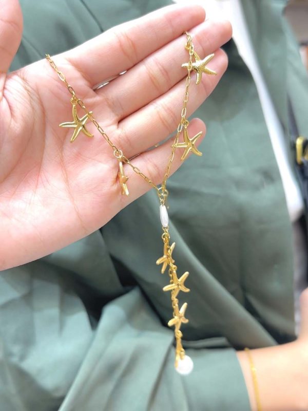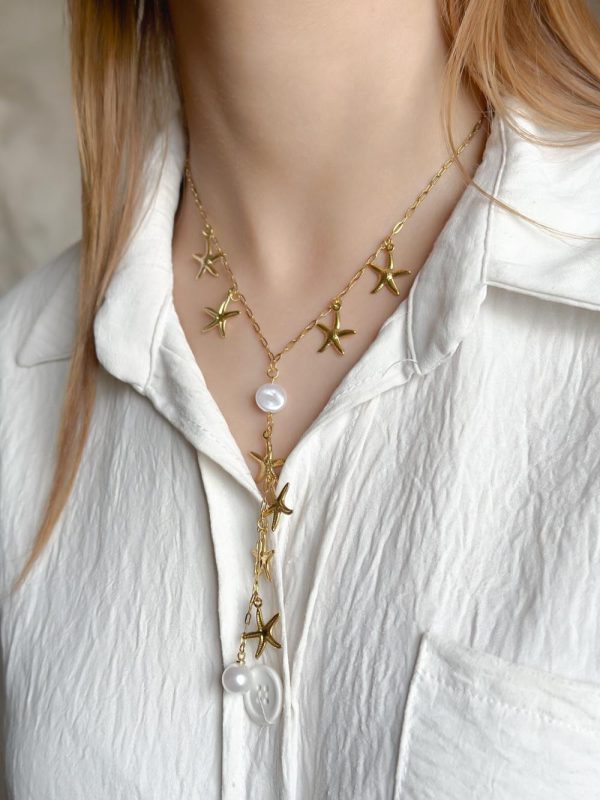 Collier marin raffiné en acier inoxydable, orné d’étoiles de mer dorées et de perles blanches élégantes.