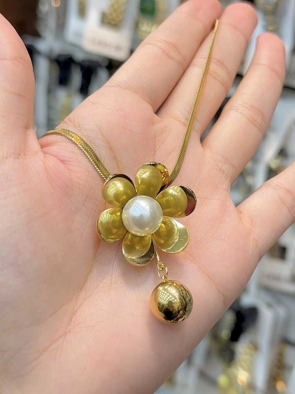 Sublimez votre style avec ce collier en acier inoxydable orné d’un grand motif fleur contenant de délicates perles blanches pour un look élégant et raffiné.