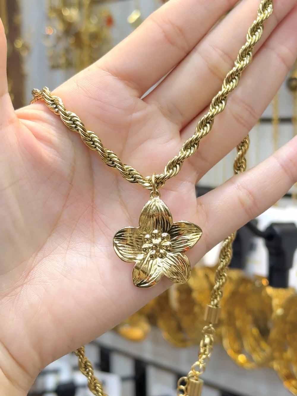 « Ce collier en acier inoxydable allie tradition et modernité à travers son style Krifcha raffiné. Sa chaîne longue et élégante met en valeur un pendentif en forme de fleur Flora, symbole de féminité et de délicatesse. Grâce à son design intemporel et à la résistance de l’acier inoxydable, ce bijou est idéal pour un port quotidien comme pour compléter une tenue chic lors d’occasions spéciales.