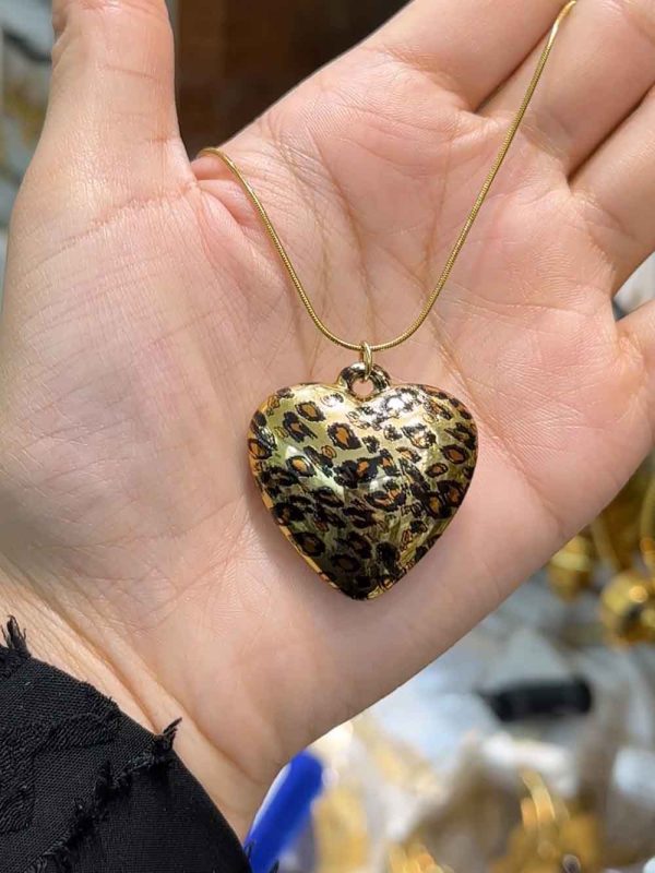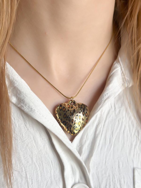 Collier tendance en acier inoxydable, orné d’un grand pendentif en forme de cœur à motif léopard.