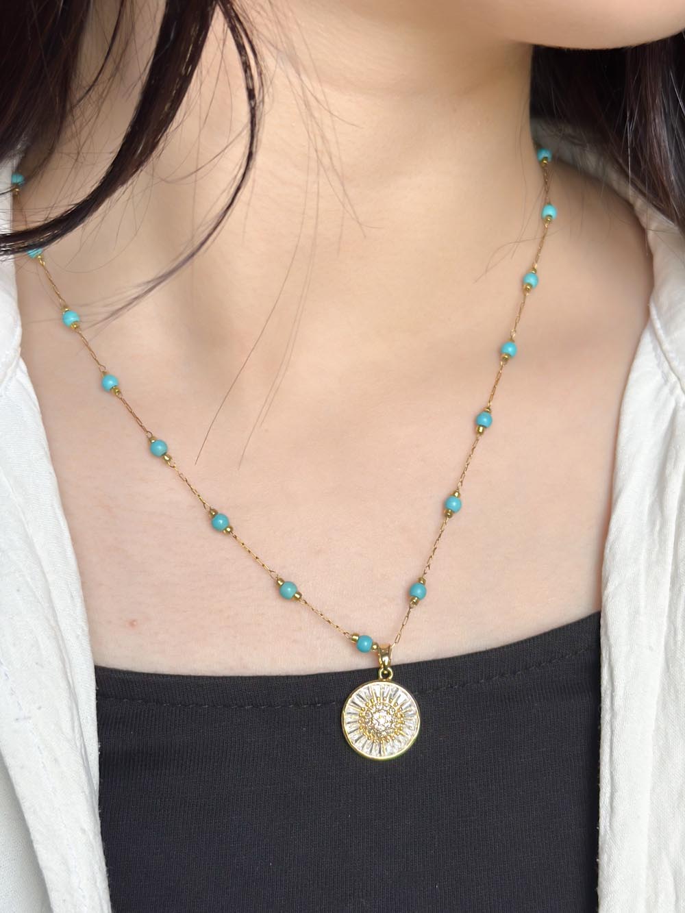 Ce collier en acier inoxydable allie finesse et modernité. Sa chaîne délicate est ponctuée de petites perles bleues, apportant une touche subtile de couleur et d’originalité. Le pendentif rond au centre ajoute une note intemporelle qui s’harmonise avec tous les styles. Grâce à sa conception résistante et élégante, ce bijou peut être porté au quotidien ou pour sublimer vos tenues lors d’occasions spéciales.