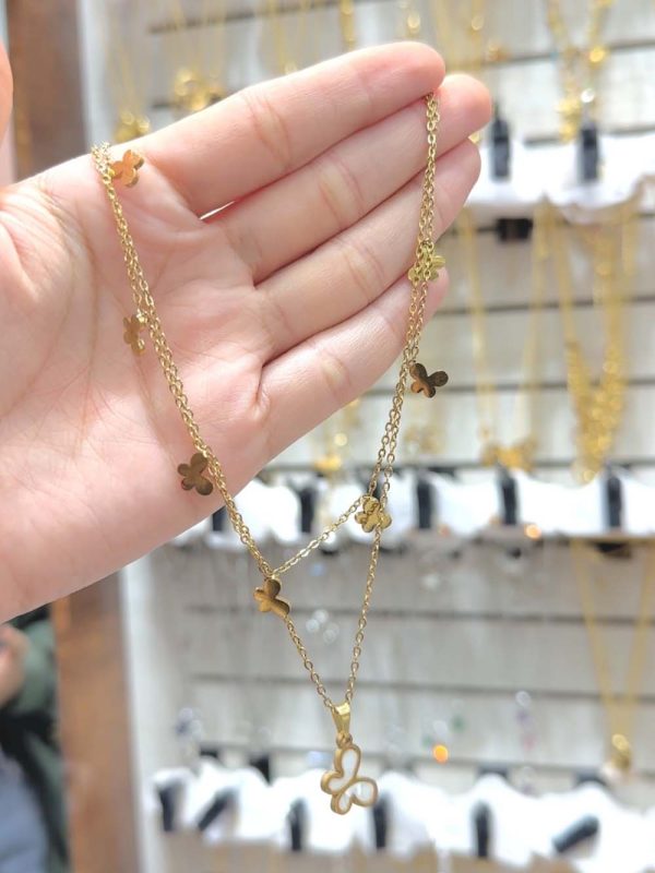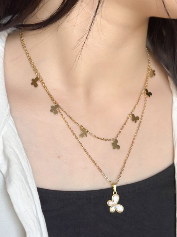 Ce collier double en acier inoxydable allie finesse et élégance grâce à son design tendance à deux rangs. La première chaîne, plus courte, est décorée de petits papillons subtils qui apportent une touche délicate et féminine. La seconde, plus longue, met en valeur un pendentif papillon central avec intérieur blanc, créant un contraste lumineux et élégant. Un bijou moderne et polyvalent, idéal pour accompagner vos tenues quotidiennes ou pour rehausser un look plus sophistiqué.