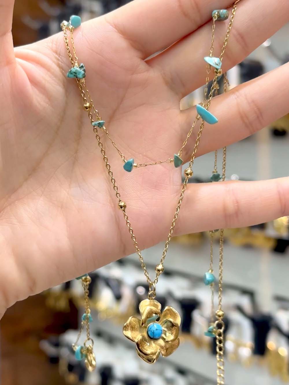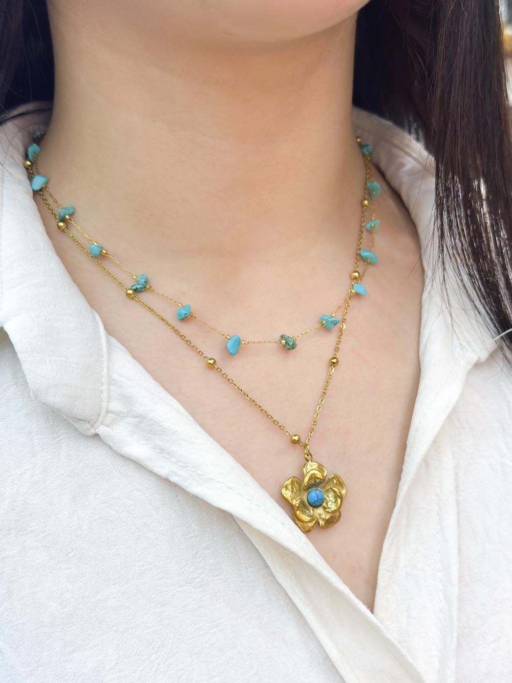 Collier raffiné composé de deux chaînes : l’une délicate et l’autre ornée de pierres bleues, avec un pendentif fleur élégant.