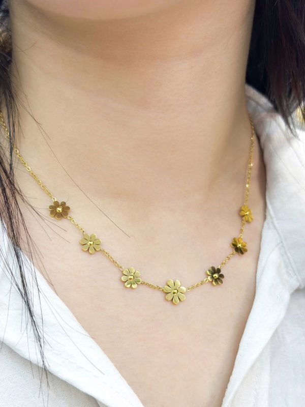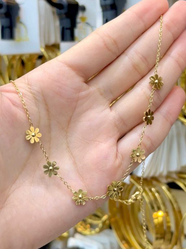 Ce collier unique se distingue par une succession de fleurs finement travaillées, formant une chaîne harmonieuse et poétique. Conçu en acier inoxydable, il offre à la fois brillance et durabilité, tout en gardant une touche délicate et romantique. Idéal pour accompagner vos tenues de tous les jours ou sublimer vos looks de soirée, ce bijou est l’incarnation parfaite de la grâce florale.