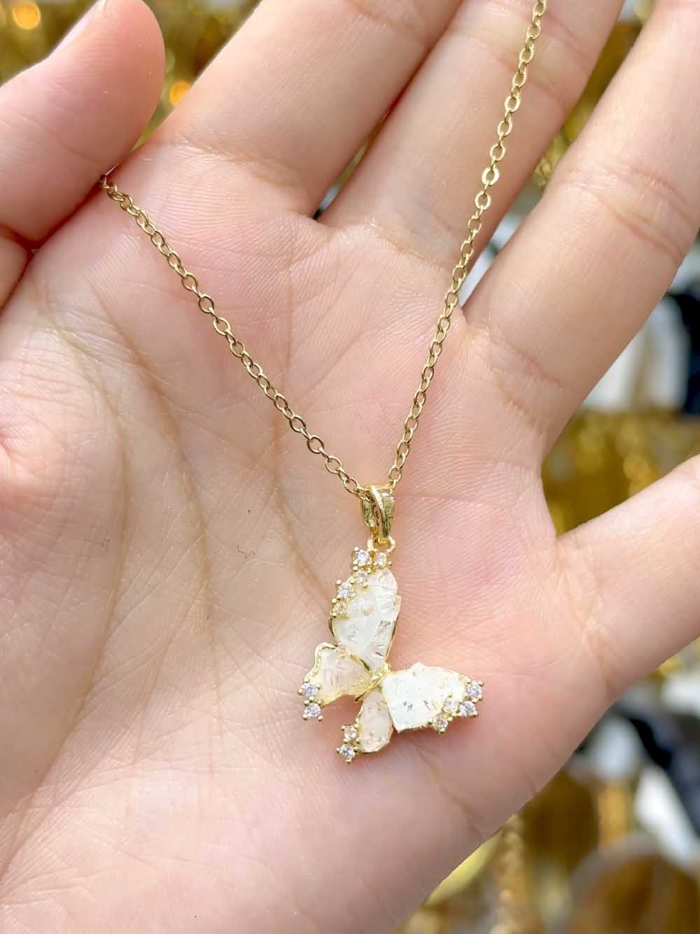 Collier raffiné orné d’un papillon délicat en blanc et rose, symbole de douceur et de féminité.