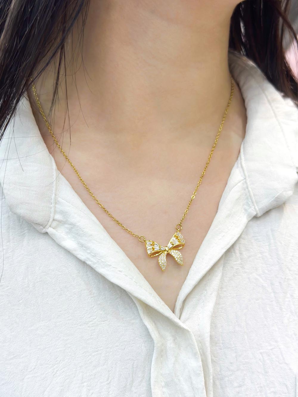 Collier délicat avec un pendentif en forme de nœud papillon, symbole de charme et de féminité.