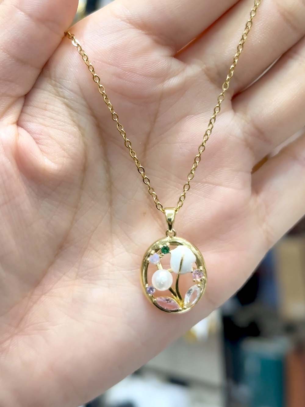 Collier raffiné orné d’un pendentif rond renfermant une délicate fleur blanche, symbole de pureté et d’élégance.
