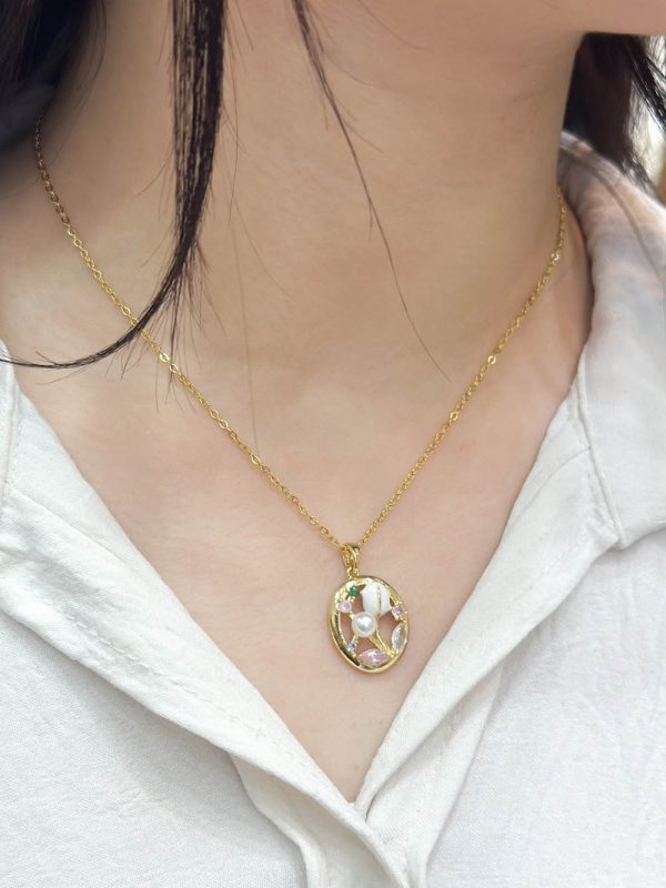 Collier raffiné orné d’un pendentif rond renfermant une délicate fleur blanche, symbole de pureté et d’élégance.