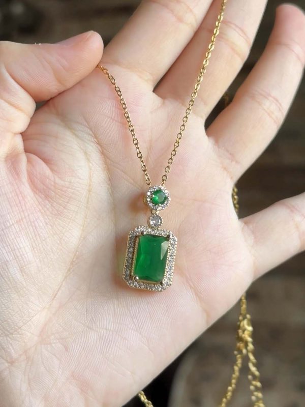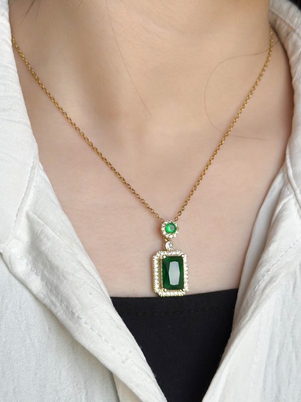 Collier raffiné en acier inoxydable, sublimé par un pendentif carré orné d’une pierre verte royale au style intemporel et élégant.