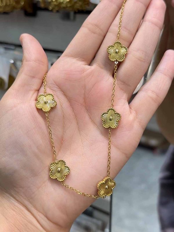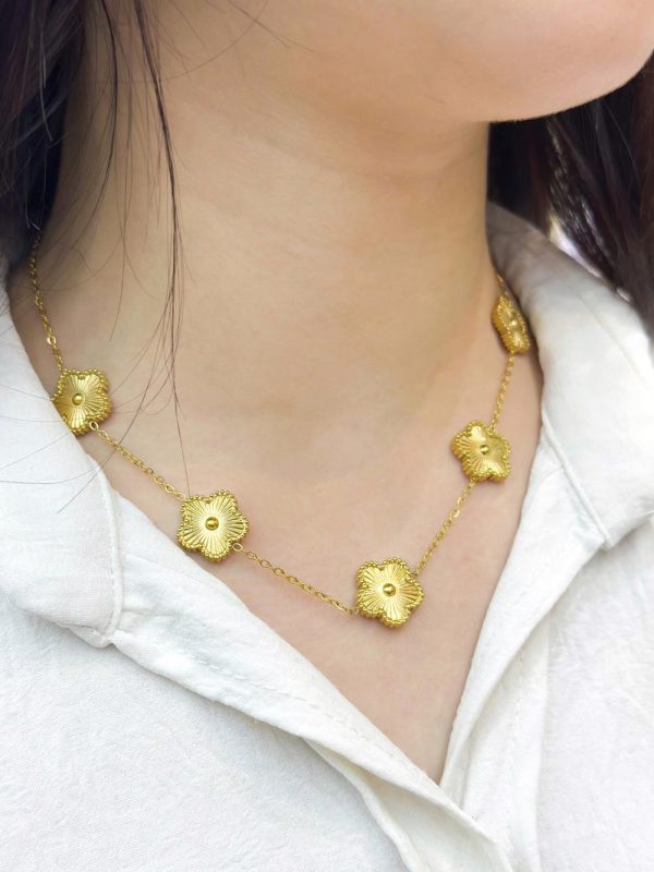 Collier raffiné orné de trèfles délicatement agencés en forme de fleur élégante.