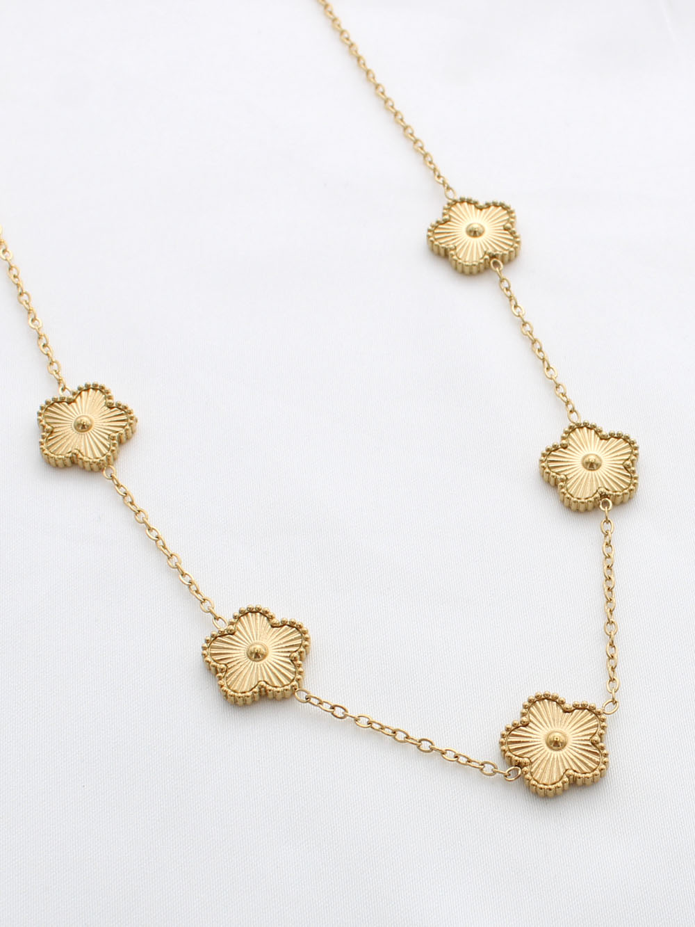 Collier raffiné orné de trèfles délicatement agencés en forme de fleur élégante.
