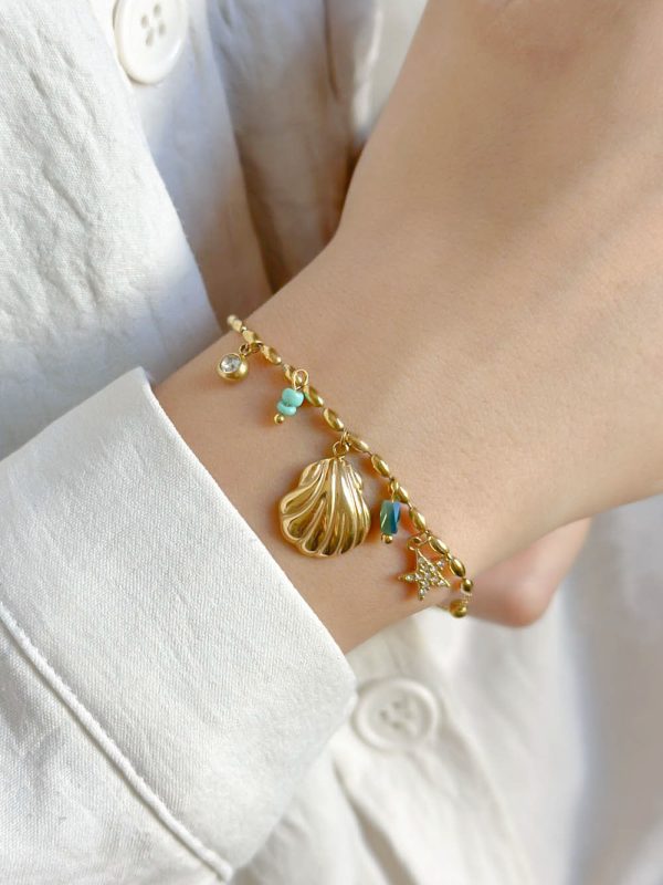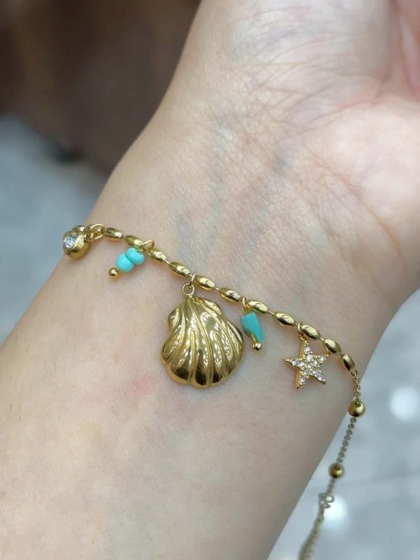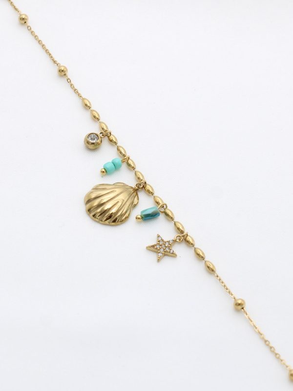 Une Gourmette estivale et originale, sublimée par un motif étoile, un coquillage délicat et une pierre bleue éclatante