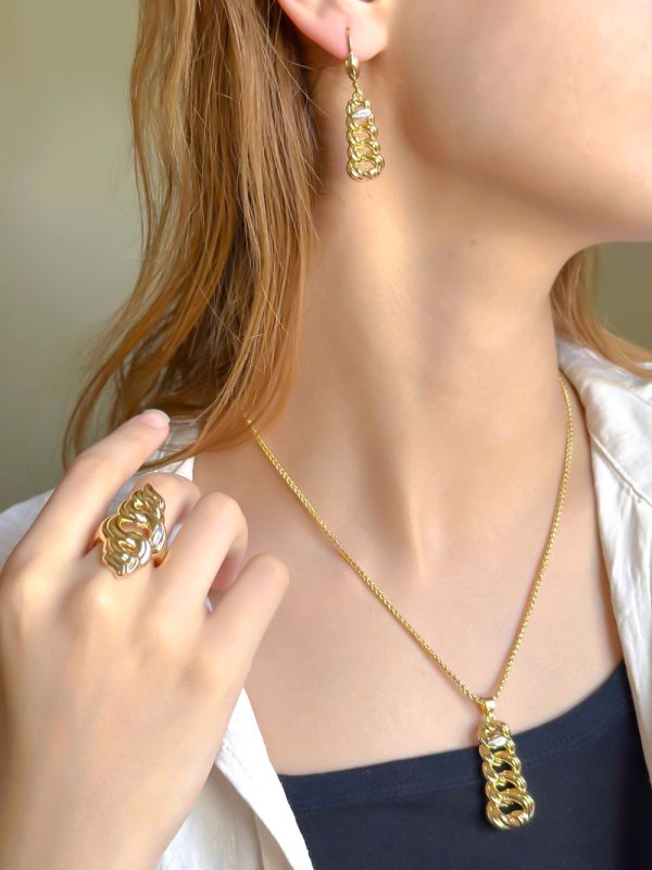 La parure Américaine réunit un collier élégant, des boucles d’oreilles délicates et une bague assortie.