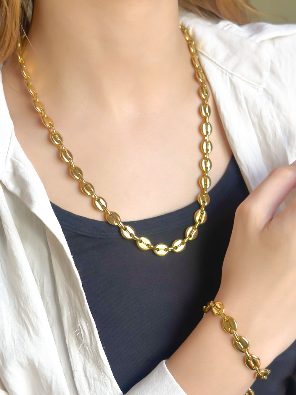 Parure audacieuse et intemporelle composée d’un collier et d’une gourmette au design Grain de Café épais, symbole d’élégance et de caractère.