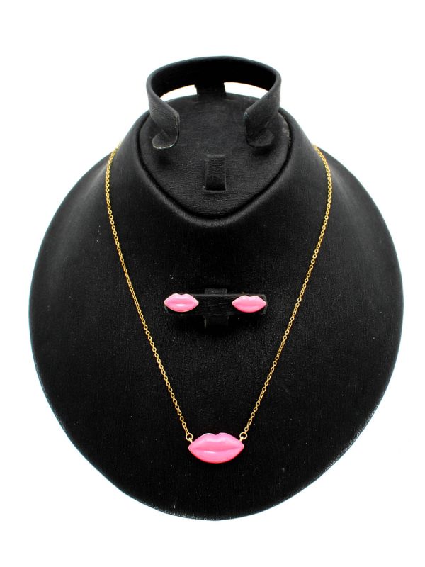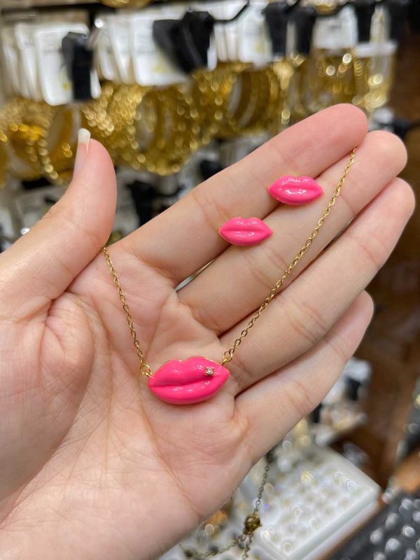 Parure féminine et moderne composée d’un collier et de boucles d’oreilles au motif lèvres. Un design original qui ajoute une touche glamour à votre style.