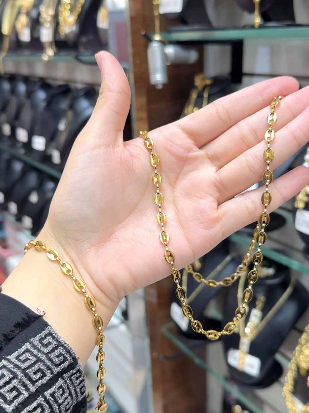 La parure grain de café se compose d’une chaîne et d’une gourmette assorties, au design fin et élégant.