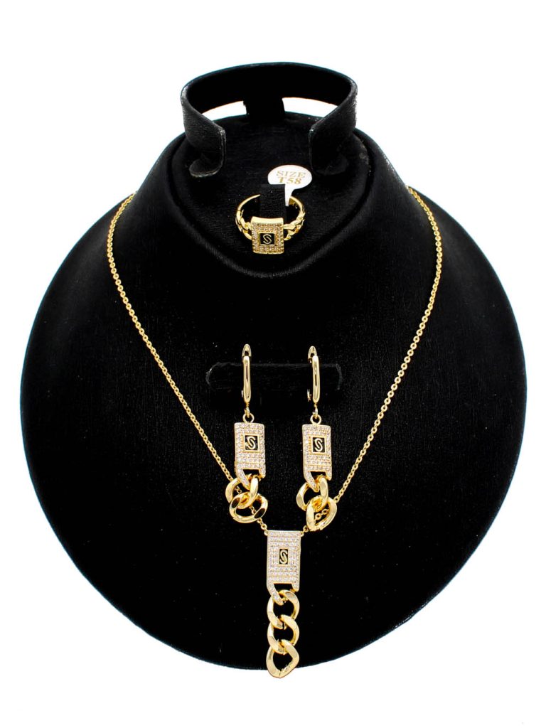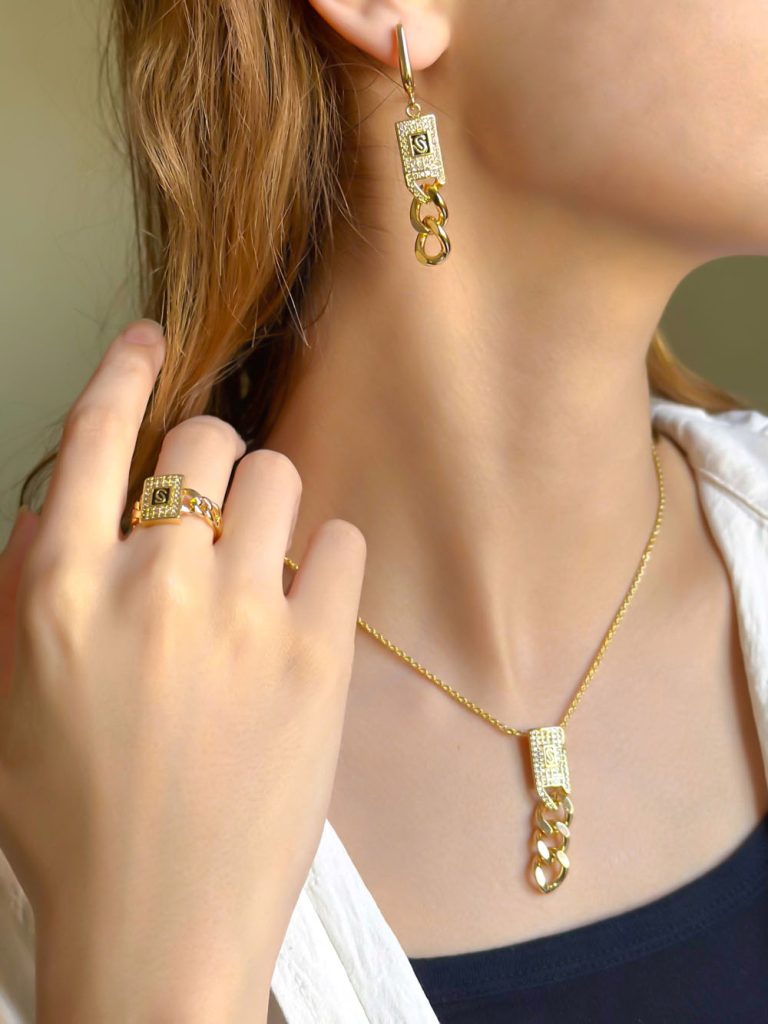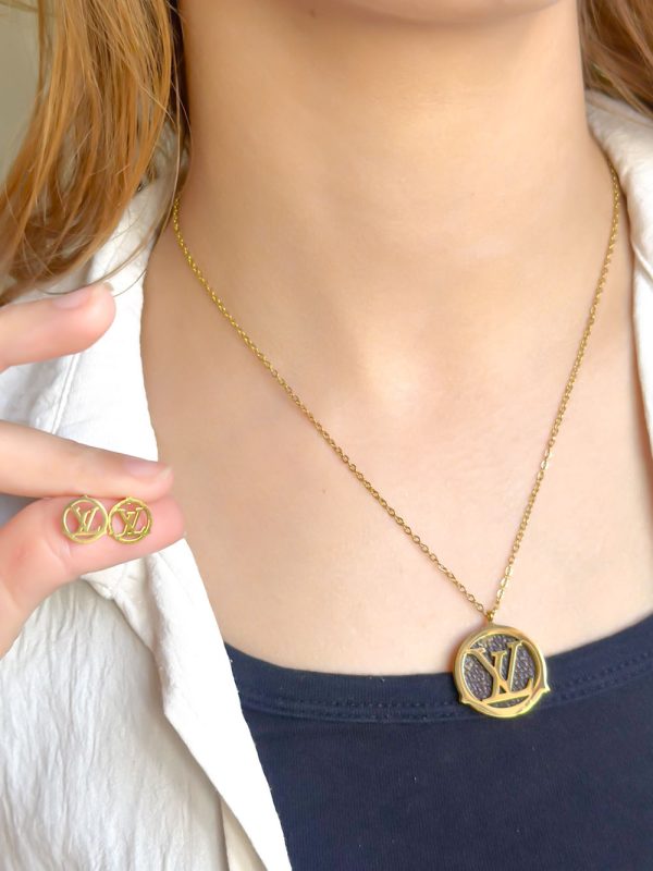 « Parure élégante inspirée du célèbre motif Louis Vuitton, composée d’un collier raffiné et de boucles d’oreilles délicates. Un ensemble chic et intemporel.