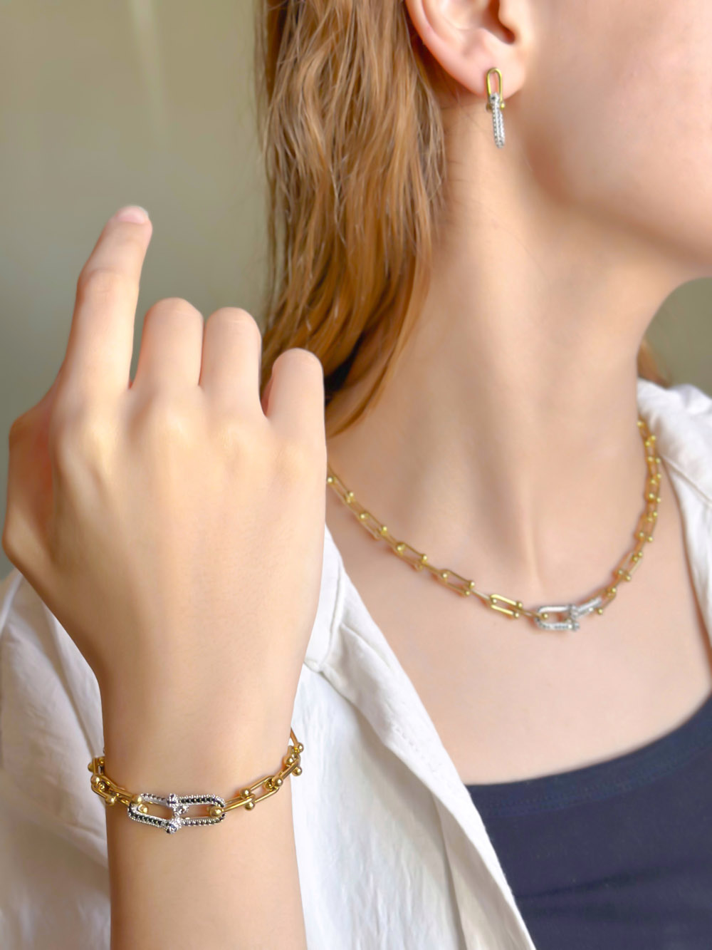 Parure chic et raffinée en acier inoxydable, ornée de pierres argentées avec détails noirs pour un style sophistiqué et moderne.