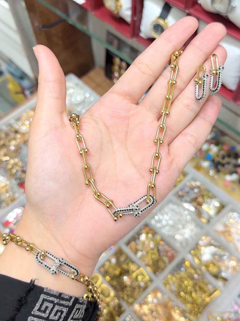 Parure Tiffany – Trois pièces élégantes en acier inoxydable avec pierres argentées et détails noirs P011408
